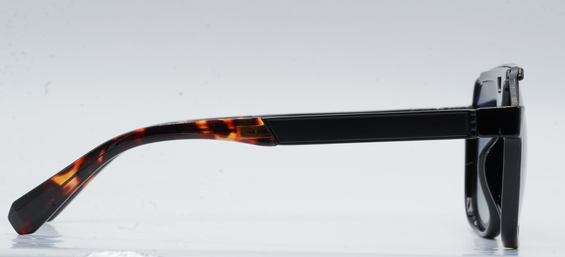 • Face en acétate : La face est réalisée en acétate noir, interrompue au niveau des angles temporaux par une barre métallique visible. Cette conception crée volontairement un espace entre le verre et la monture, apportant une signature visuelle technique.